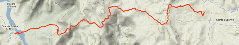 1. Saint Suzanne to Grande Riviere du Nord - 7.3 miles. This is one of my favorite trails; it follows a gently rolling ridgeline with amazing mountain backdrops throughout. The path is wide and easy to follow. Saint Suzanne is an attractive mountain village while Grande Riviere is a large town. A river crossing is required at the latter; the water is filthy and waterproof boots or sandals would be a very good idea. There are regular buses from Cap Haitien to Grande Riviere (the last one is around 5) and there are likely buses to Saint Suzanne as well (or at least mototaxis). There is currently no lodging at either end. The eastern trailhead is at the radio tower above the town.