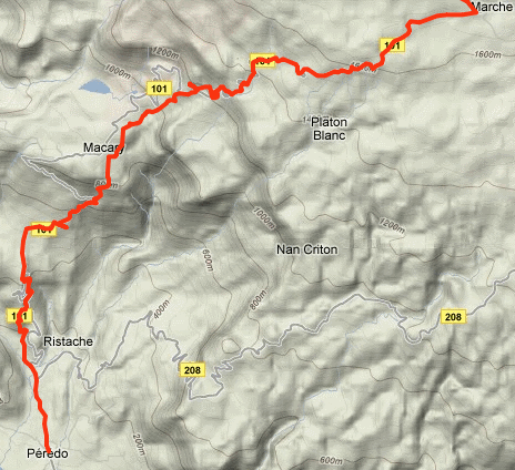 4. Furcy to Seguin - 14.2 miles. A fantastic pedestrian thoroughfare leads from Furcy to the remote mountain junction of Seguin (Marche?). Plenty of villages with food and drinks near the Furcy end. As the trail nears Seguin, it passes through a dense pine forest where mototaxis are available and there are few pedestrians. There is a lodge at the Furcy end which is very expensive; there may be more affordable options in Kenscoff. There is supposedly a lodge in Seguin but I was not able to find it. At Seguin, you can continue on to Mare Rouge and Pic de la Selle to the east, or you can go south to Depot and Marigot; mototaxis are available for both directions.