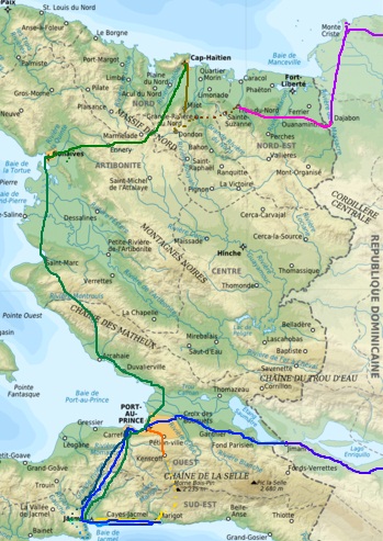 5. Seguin to Depot (Marigot) - 10 miles. This is actually the main road that connects the coast to the mountains; you can occasionally find a truck that plies the route, but usually you have to pay top dollar for a motorcycle taxi. It is much easier to walk south than north. There are many shortcuts and alternative trails that can be spotted from above and make for a fun break from the monotony of the road. From Depot, there are regular buses to Jacmel which cost about 50 gourdes.
