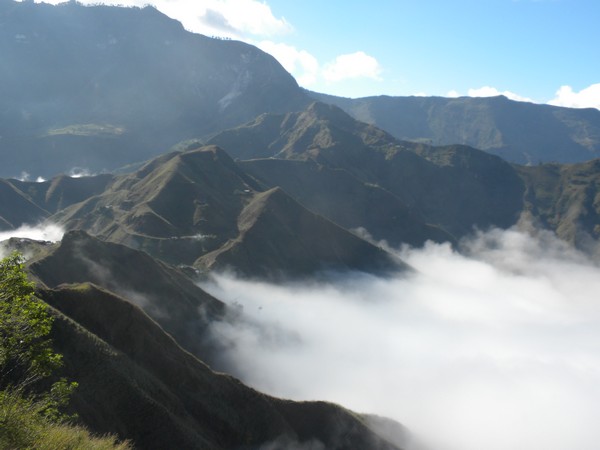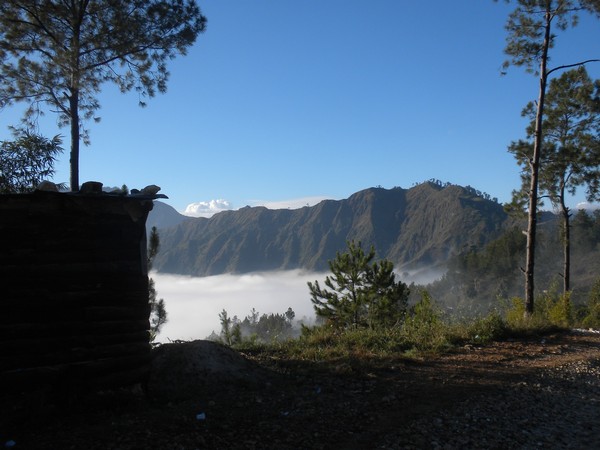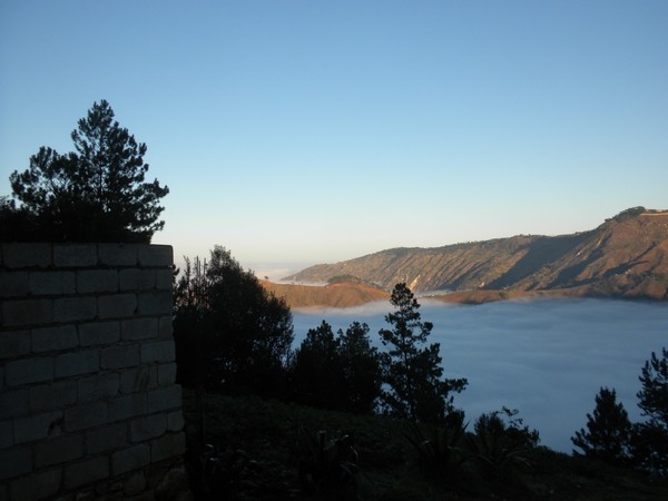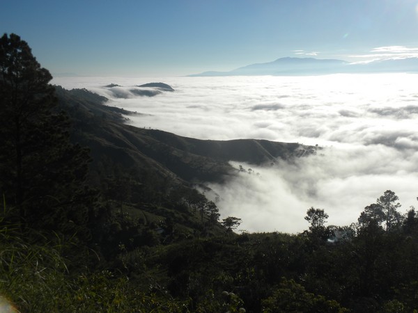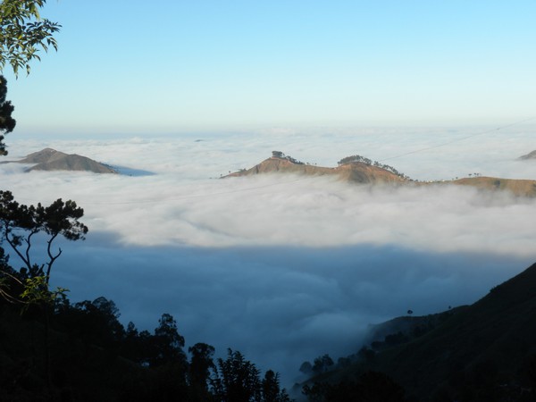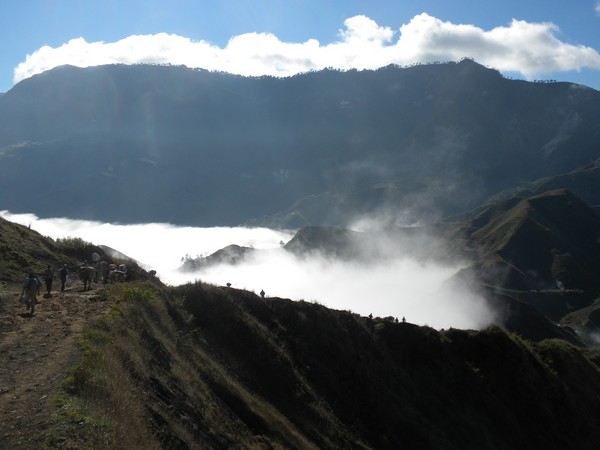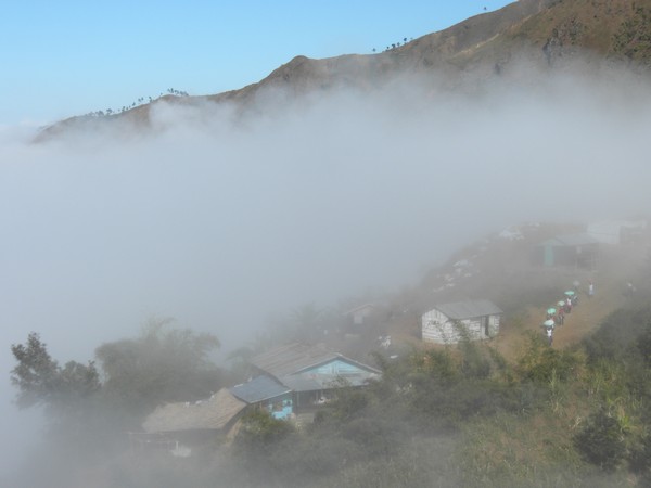 A little ways up the trail, the path was partially blocked by a large boulder which had fallen from the cliff above, and a couple of men stood atop it, hammering away with pickaxes. The trail followed a jagged series of peaks, dipping in and out of the clouds and providing some of the more spectacular views I've seen on a hike. At one point, the path flattened out and became a road on which motos could be driven and the pedestrian traffic dropped to a trickle. It soon entered a deep, dark pine forest, a true rarity in this country, and provided a very cool, peaceful walk into Seguin.