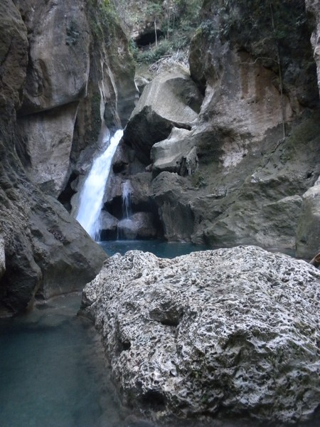 6. Bassins Bleu, Baguete Loop - 12.75 miles. From Rue Comedie in Jacmel, this route crosses a nasty river (mototaxi, horse or truck recommended), and follows a well signed road up a mountain to some really nice waterfalls that offer excellent swimming and cliff diving. There are also two trails that go up to the falls, but these are difficult to follow. From the falls, you can continue on along a series of trails to Baguete and then back along the beach to Jacmel. This route has many forks and some treacherous terrain, but is very scenic.