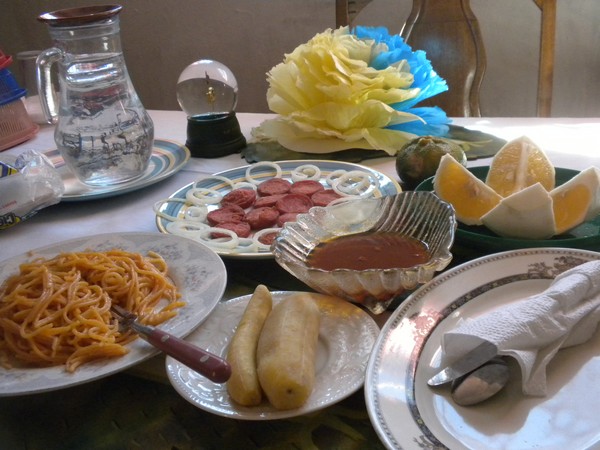 Baba's wife offered to make me breakfast in the morning; I wasn't really hungry and was ready to get on the trail before the sun got too high in the sky, but wasn't in much of a position to refuse. While I waited, a crazy neighbor dropped by to rant about various things; he wore a warm-up suit from the Naples Varsity Cheerleading Squad, which he had stuffed full of plastic bags. Two hours later, breakfast was ready; with an amazing spread of sausage, onions, plantains and sauce, coffee, and spaghetti, it was enough to rival the immense dinner I had polished off just hours before.