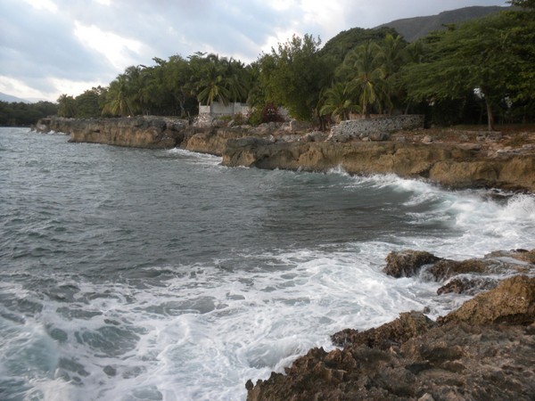 By the time I had finished eating, the cooling wind had died down and the sun was baking the exposed mountainside. Safaraz, his friend, and I set out on a rather vertical trail, bound for Baguete. The long-legged, packless Haitians, who made the long hike into town on average twice a day, sprinted ahead; they needed no water breaks and I never once saw them eat; we hiked up and over the ridge and then down to Baba's sister's house. Here, one of the two scaled a palm tree and fetched a couple of green coconuts, and hacked into each with a machete so we could drink the sweet liquid within. The next segment of trail was a treacherous goat path; I slipped and tripped down the steep grade while the sure-footed Haitians danced along it effortlessly, yelling back "careful" in response to my every blunder. At the beach, we came across a boatload of fishermen who were just unloading their catch. Among other things, they had a bucket full of lionfish and were in the process of removing their spines. We followed the beach until we reached a rocky headland and took a trail up and over. A series of stream crossings necessitated that I walk barefoot through long stretches of contaminated water; if I were to do it again, I would probably just grab a mototaxi and thus avoid the nagging question of whether microscopic worms had just burrowed through my skin.