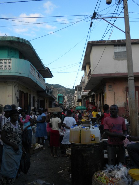 No one knew about a trail to Grand Riviere and told me repeatedly that I was certainly lost. The road took me to the town of Saint Suzanne, which was, more so than any other I had found in Haiti, a picturesque mountain town. I spotted a radio tower on a grassy hill up above the town and hiked up to it; there, I noticed a trickle of people making their way along a ridgeline trail; I asked one and found that it was in fact the way to Grand Riviere. The footpath was truly excellent; it followed grassy ridgelines through an incredibly scenic mountain landscape, was clear and easy to follow for its entire length, and had next to no people on it. In one place, I passed a working cane grinder that was being driven by a team of oxen; had I thought much about it at the time, I would certainly have asked for a liter of fresh cane juice since my water supply was all but depleted. I eventually came to the town I sought and had no choice but to take off my shoes and cross a stinking, garbage-filled (not so grand) river. On the other side, I found a market stall where a woman, operating a restaurant out of the usual assortment of buckets sitting in mud, but wearing an immaculate royal purple dress, served up an excellent dish of rice, peas, legumes and meat out of buckets for 50 gourdes. I soon discovered that there were no hotels in town and I had no choice but to take a bus into Cap Haitien for the night. I found the bus station, but decided to explore the town a bit more, and, in the interim, the last bus of the evening took off for the city.