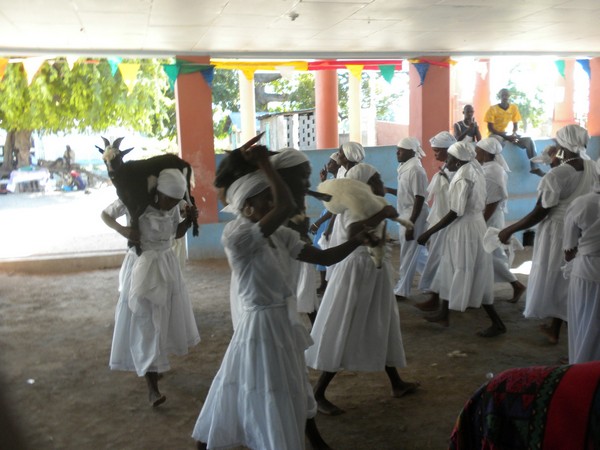The "lakou" of Soukrit was a small collection of houses situated around a temple complex. A ceremony was in progress inside and I warily kept my distance, but someone sitting in the courtyard invited me to go and look through the window of the temple. Inside, about thirty people, dressed all in white sat on benches around the room and a head priest and some drummers sat facing them. The whole setup reminded me of a Krishna temple; the congregation belted out a repetitive chant while the drummers kept the beat. A small alter with some candles, booze, sodas, and cakes sat on the floor towards the front. One woman on the edge of the room held three live chickens in her hands. Two white women, clothed the same as the others, sat in one corner of the temple. Several Haitians in plain clothes, some with camera phones at the ready, looked on expectantly from the courtyard. Three extremely cute goats were tied to a pillar outside.