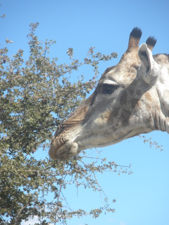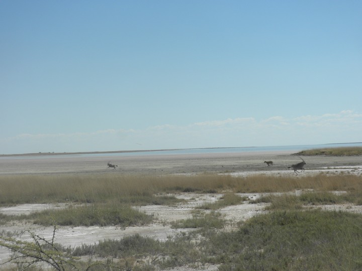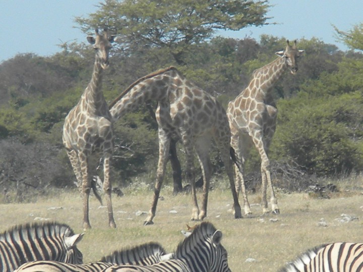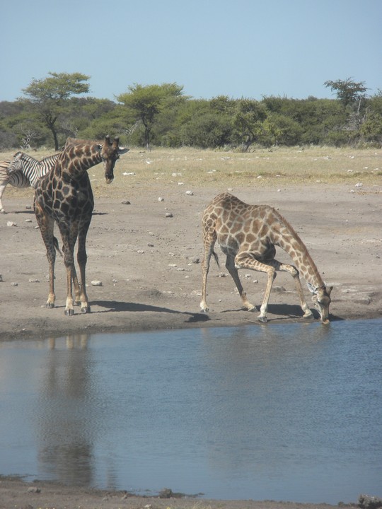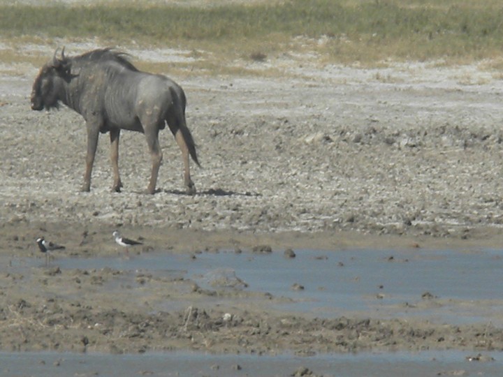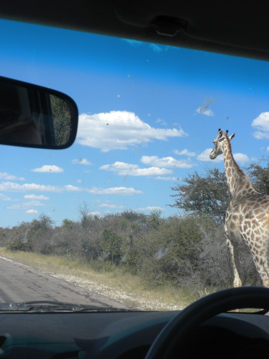 We were packed and ready when the park opened at 6am, but that was still not early enough to catch the two cars that whizzed through just before we got to our post. We waited for two hours, as the ranger helped us catch and beg each in the small trickle of tourists who entered the park. Every car was either full, unwilling to take us (admittedly, we probably smelled pretty rank by then), or wasn't doing a day trip. Finally, around 8:30am, a Namibian/German woman and her young daughter volunteered to take us. The mother had been there around fifty times and was an expert on the park. Our first foray to the eastern section of the park yielded nothing, but as we headed west, we soon came to a watering hole where we were able to watch as a number of giraffe came up, scared away the other animals, and very cautiously knelt down to drink. On our way back to the main road, the daughter noticed a shape off in the distance and excitedly cried out "rhino!". Sure enough, a black rhino bumbled right up to our car, too blind to even notice we were there; our host scooted us out of the way just in time to avoid an accidental impact.
