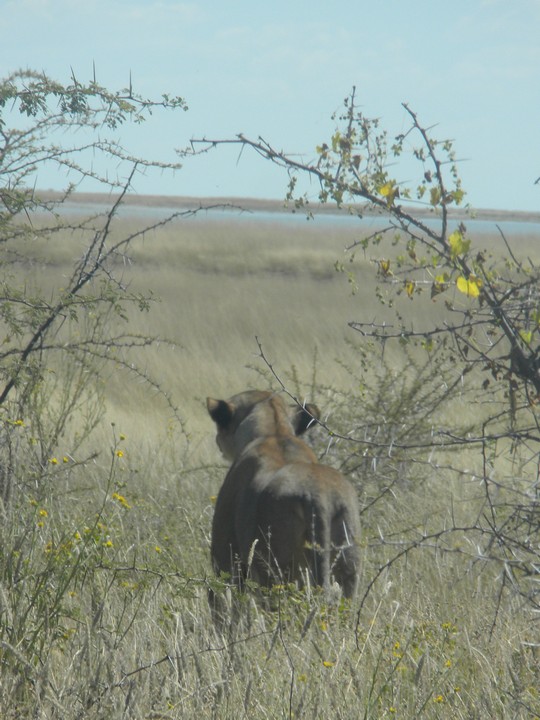 On the way out of the park, we stopped next to another car that had parked in the middle of the road; they had somehow managed to spot the butts of two sleeping lions in the trees. This was pretty exciting as we imagined we had zero chance of seeing a lion in the daytime. We tried our best to get a clear picture of the butts, but soon gave up and continued toward the gate. But then, coming down the side of the main route, was none other than a lioness. Our driver made us roll up the windows as the lion stalked casually past and slunk into the weeds on the side of the road. We spent the next 45 minutes catching glimpses (or supposing we caught glimpses) of rustling grass that tipped us off to the location of the hunter. Then, as our patience neared its breaking point, the lion exploded out onto the open plain and into the middle of a group of oryx. They easily evaded her and, ashamed, she slunk silently away.