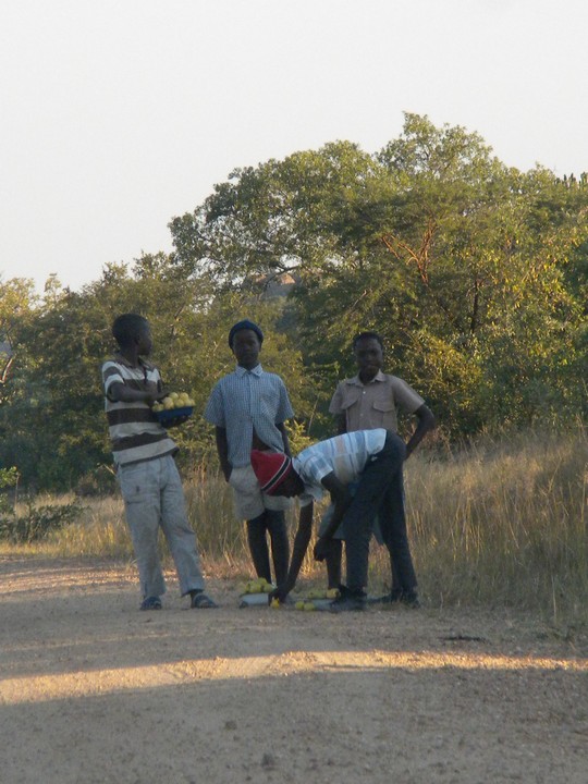We drove onward to something that was marked on the map as Halfway House National Monument. There we found a lodge and bar, but no one who had any idea where the monument might be. In Lusane, we got some delicious sadza and beef, coupled with a Fanta, for $2. We discovered that the petrol station listed on the map was dry and had to pay $2/liter for blackmarket gas. After spotting the umpteenth adorable kid hoisting a watermelon over his head, we finally gave in and shelled out the 5R - even though we had just eaten not half an hour before; I am of the opinion that watermelon is one of those foods that can be enjoyed regardless of how full you are, but Matt felt differently and so found a way to integrate it into his already precarious packing strategy.