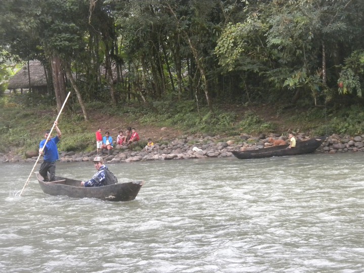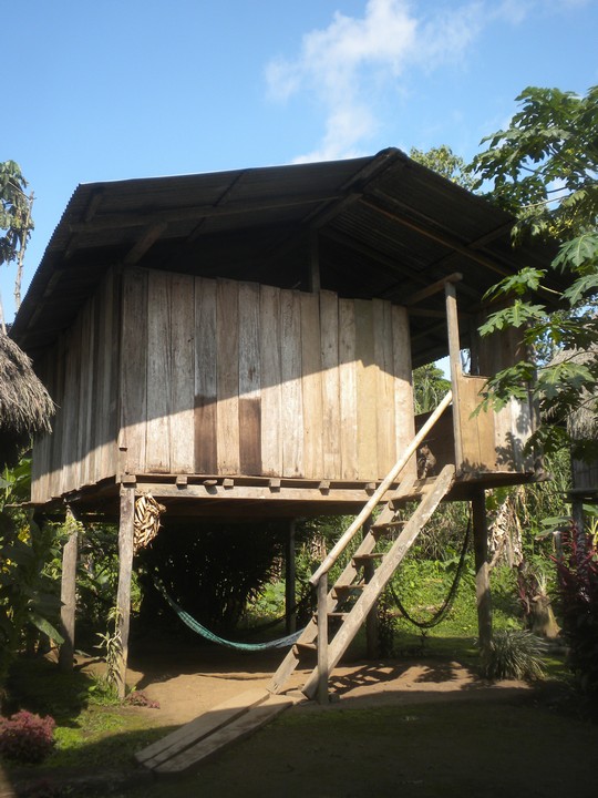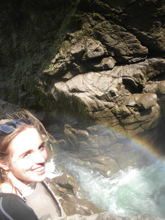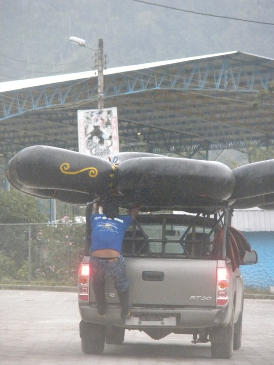 We arrived in Mindo around noon and went straight to the nearest tourist office to inquire about tubing. It turned out there was a tubing trip leaving in 10 minutes and they would pick us up from our hostel. No matter that we did not yet have a hostel – we gave the woman a name from our guidebook and raced across town to see about getting a room. The hostel was a wooden shack on the edge of town, eagerly encroached upon on three sides by the verdant, boisterous jungle. We changed into our swimsuits and, moments later, a pickup appeared at our doorstep. We jumped in the back and sped down a bumpy mud road to the outfitter, brightly-colored birds flitting out of our way as we bounced along the riverbank. At the rafting shop, our truck was outfitted with life vests, helmets, and an amazing contraption composed of seven truck tire tubes tied together in a hexagonal pattern. Along with a random Ecuadorian family, we geared up and jumped in the frigid river and planted our butts in the tube junctions and our feet on the walls.