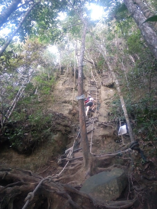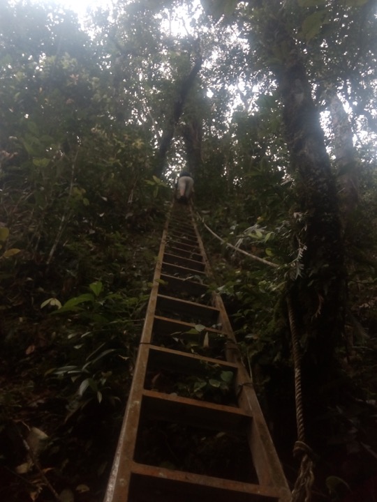 The terrain was immediately difficult and we grappled up steep muddy slopes using thick vines and root systems. Exposed metal ladders, 20 meters in length, ran up the cliffs, but the rungs were extremely slippery and only the junctions with the rails were of any real use. And then there were the leeches. They were silent and fast and invincible. They would grab onto the sole of your shoe and be crushed against rocks a hundred times before slowly moving up and finding a patch of skin. They would crawl deep into your sock or far up your pant leg. Many would make the long journey from ground to groin. Others would drop from the trees and find purchase on our scalps and necks and faces. We never wanted to stop to pull them off because we knew that doing so would only allow more to catch us. We felt our life slowly draining away, into the bulbous black bellies of a hundred tiny assailants.