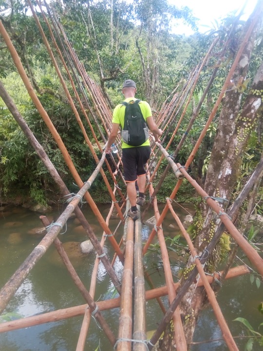 It began to rain and the path became far more treacherous. Downhill stretches turned to uncontrolled slides, which left me covered in mud and leeches. One such slide was coupled with a vine that hung in the middle of the trail and latched onto my nostril and forehead with spikes that held with a tenacity that threatened to rip my face apart. I couldn't confirm till hours later that my nose was largely still intact.
