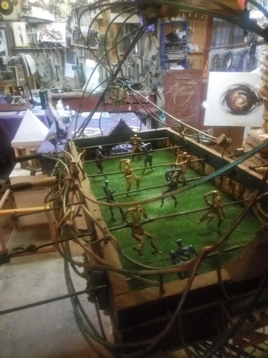 | Topless bald girl in heels, riding a rooster, wielding a fork |