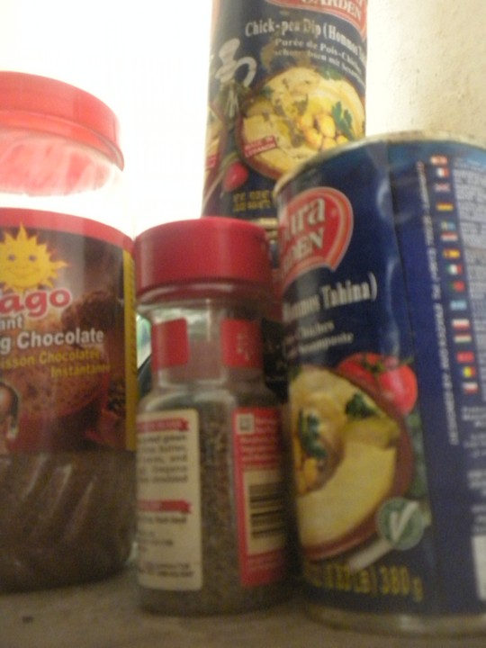 All the essentials: chocolate drink mix, basil, and 6 cans of hummus