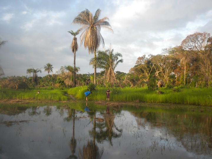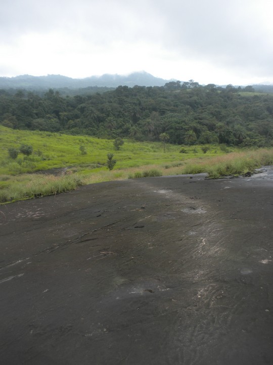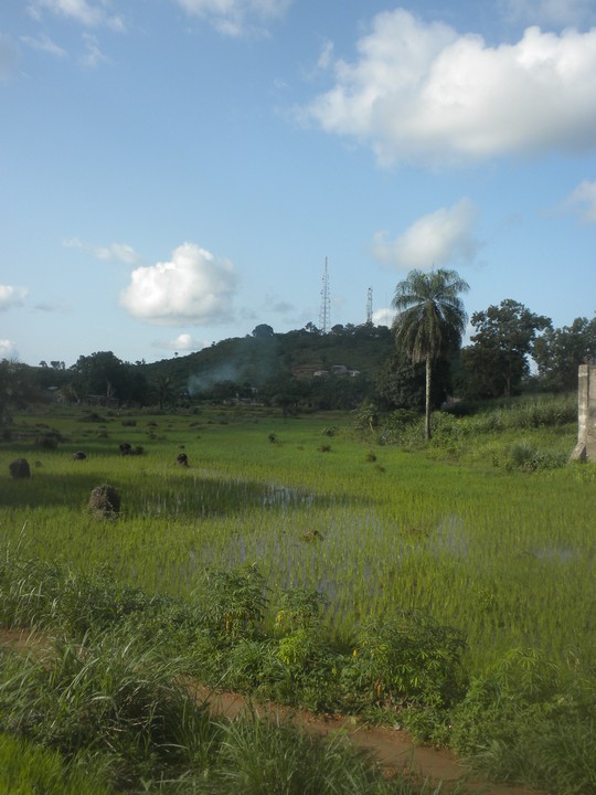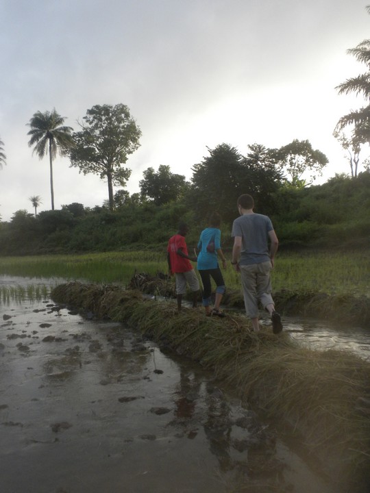 The average walking pace of a Sierra Leoneon is ludicrously slow, but Bob and his friend were actually very speedy hikers, and they were quite skilled at instantly choosing the right path at an unmarked fork. The trail took us through the rice paddies, and up and over a big rock, then continued through dense jungle to multiple small villages – each had an intricately woven vine gate at its entrance. We arrived at one woman's hut just in time for lunch, and she shared with us her family's bowl of boiled bananas and palm oil.