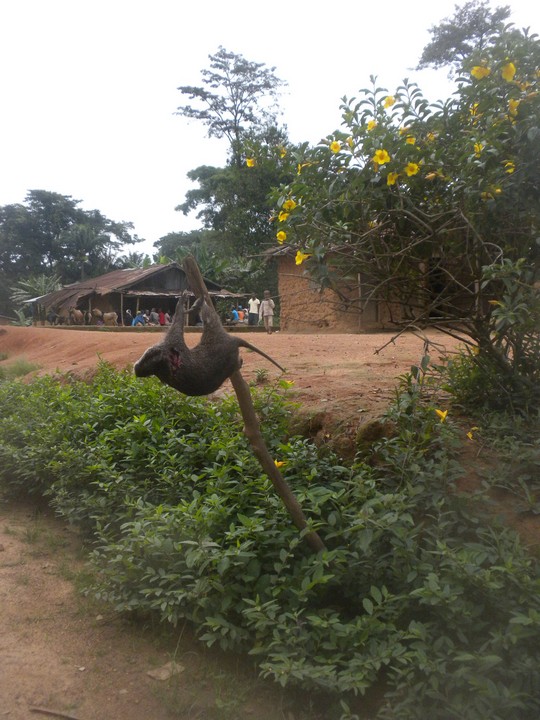 We had planned on leaving for Kenema around 9, but I got a call from the principal at 6:10 informing me that the taxi would be coming my way in 45 minutes. My cell phone didn't work, so on the off chance that the car actually showed up at the checkpoint on time, I raced to get ready and eat the dinner that had been prepared for me the previous night. I showed up 10 minutes late, then hung out with the police for an additional 45. We took the same Peuguet, this time with 6 passengers, back to Kenema. Along the way, the driver stopped to buy an otter hanging from a stick on the side of the road.